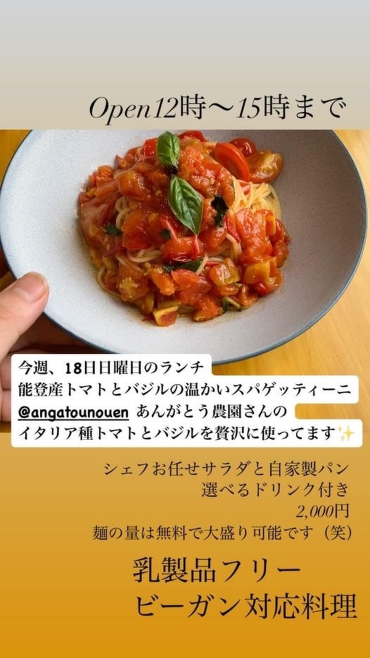 OPEN 12:00〜15:00(close) 現在、 日曜日,月曜日のみ営業。カレンダーにて確認して下さい。 Lunch(ランチ) 12:00〜15:00 ご予約制コース料理,ご連絡ください。 1日2組様 Trattoria(バルの日)17:00〜21:00 現在、 日曜日のみ営業。カレンダーにて確認して下さい。 Dinner ディナー17:00〜21:00 ご予約制コース料理,ご連絡ください1日2組様
